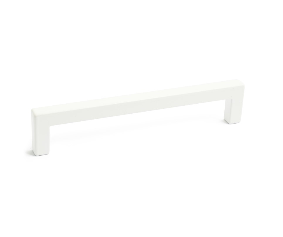 Handtag av vitlackerad metall i stilren design för möbler, lådor, luckor och skåp.