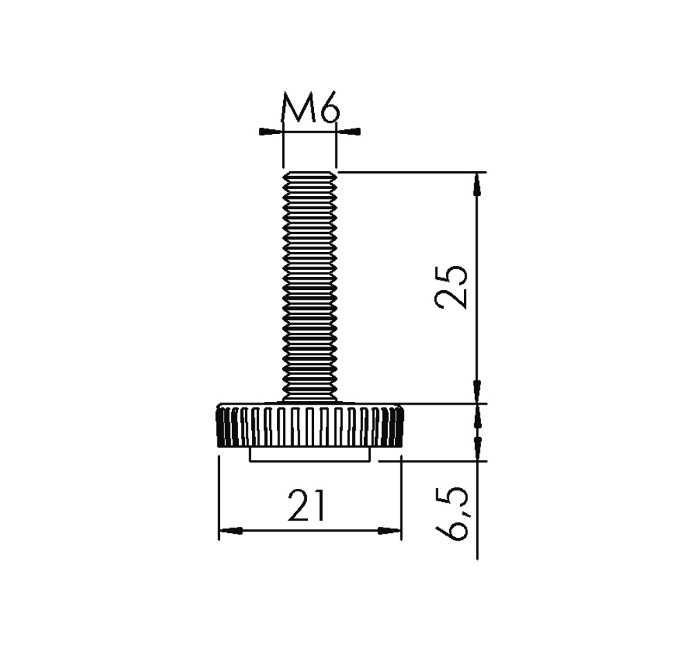 Ställbar fot av svart plast och ett gängstift av zink med 6mm gänga.